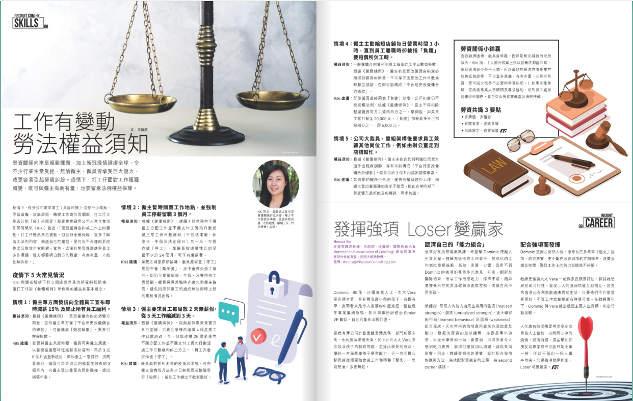 疫情下,很多公司要求員工「共度時艱」,引發不少減薪、停薪留職、放無薪假、轉變工作崗位等個案,打工仔又是否只能「疫」來順受?凝資專業顧問公司人事企業培訓師何珮琪(Kiki)指出:「面對僱傭合約或工作上的變動,打工仔雖然角色被動,但並非全無保障,宜多了解勞工法例內容,知道自己的權益,便可向不合理的更改作出反對或申索賠償。當然,這個時勢管理層應與員工多作溝通,雙方都要明白對方的難處,有商有量,才能化解糾紛。」