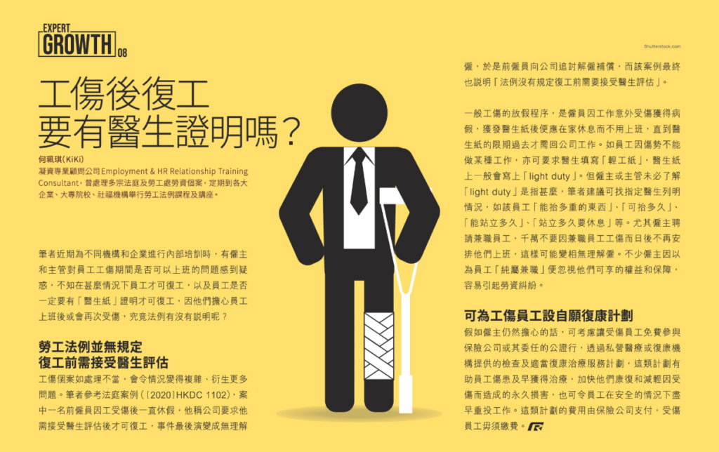 筆者近期為不同機構和企業進行內部培訓時,有僱主和主管對員工工傷期間是否可以上班的問題感到疑惑,不知在甚麼情況下員工才可復工,以及員工是否一定要有「醫生紙」證明才可復工,因他們擔心員工上班