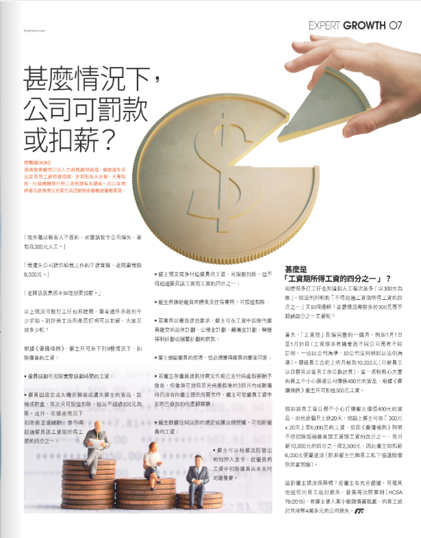 「我失職以致客人不簽約,老闆話我令公司損失,要扣我300元人工。」 「我遺失公司提供給我工作的手提電腦,老闆要我賠8,000元。」 「老闆話我表現未如理想要扣薪。」 以上情況可能打工仔也有